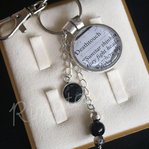 Show your love for Magic the Gathering with this keyring. You can hang it with your keys or use it as a bag charm to adorn your card bag as you head out to Friday Night Magic. It is a simple cabochon keychain made from an actual card. Each keychain is made by hand, featuring dangling rhinestones and beads.