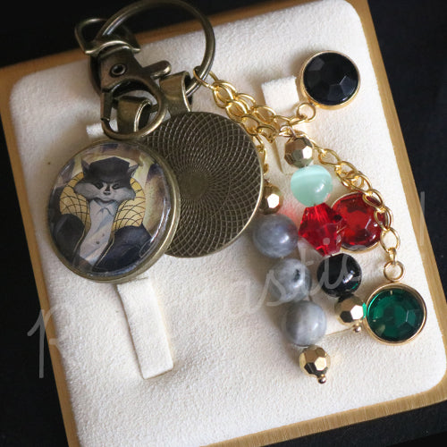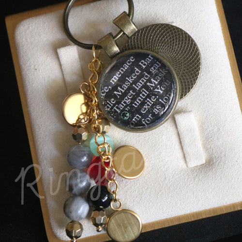 Show your love for Magic the Gathering with this keyring. You can hang it with your keys or use it as a bag charm to adorn your card bag as you head out to Friday Night Magic. It is a simple cabochon keychain made from an actual card. Each keychain is made by hand, featuring dangling rhinestones and beads.