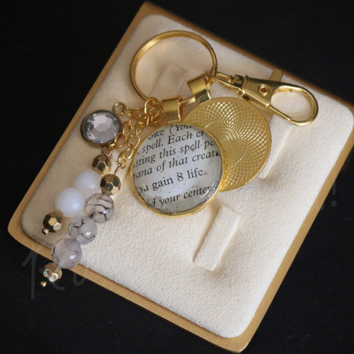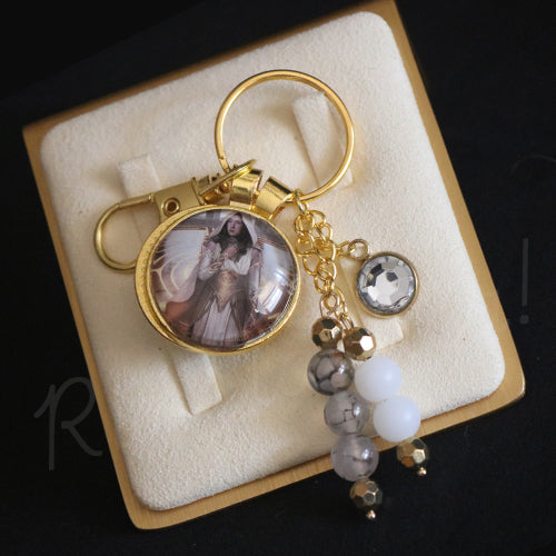 Show your love for Magic the Gathering with this keyring. You can hang it with your keys or use it as a bag charm to adorn your card bag as you head out to Friday Night Magic. It is a simple cabochon keychain made from an actual card. Each keychain is made by hand, featuring dangling rhinestones and beads.