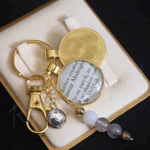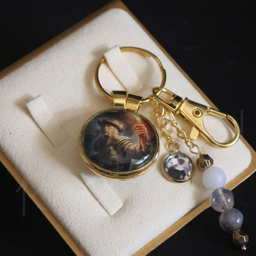 Show your love for Magic the Gathering with this keyring. You can hang it with your keys or use it as a bag charm to adorn your card bag as you head out to Friday Night Magic. It is a simple cabochon keychain made from an actual card. Each keychain is made by hand, featuring dangling rhinestones and beads.