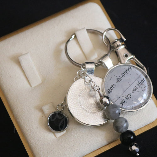 Show your love for Magic the Gathering with this keyring. You can hang it with your keys or use it as a bag charm to adorn your card bag as you head out to Friday Night Magic. It is a simple cabochon keychain made from an actual card. Each keychain is made by hand, featuring dangling rhinestones and beads.